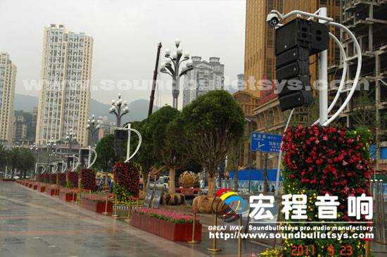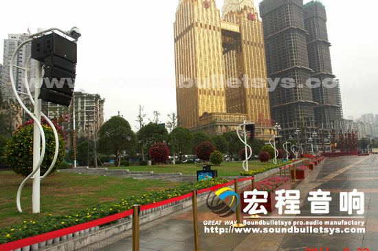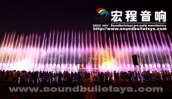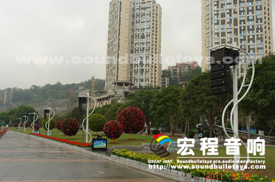 重庆南滨公园全天候扩声系统工程共采用了十九组宏程声必力全天候防水扩声音箱分布在喷泉四周,功放上则采用了性价比较高的声必力PRO系列功放。目前系统经顺利通过专家组验收,系统运作良好。