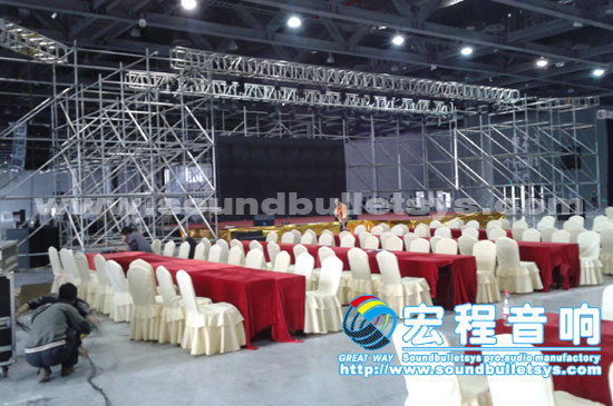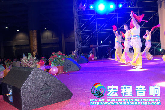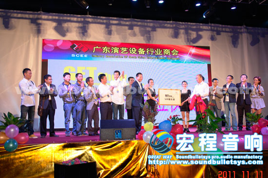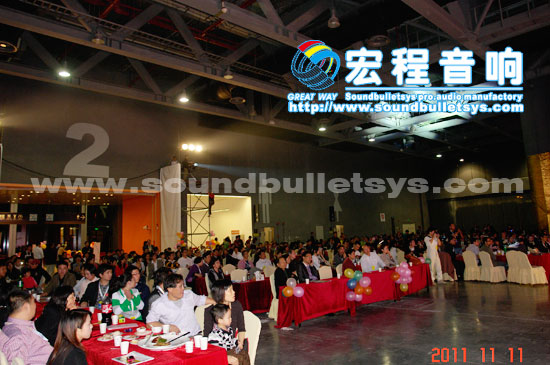 11月11日晚广东演艺设备行业商会 2011会员欢乐嘉年华晚会在广州琶州保利展览中心举行。800多人参加了本次晚会。广州宏程音响工业有限公司承接了本次晚会的扩声工程。晚会采用了8只声必力LA-10F线性作主扩、返听音箱则采用了6只MA-15音箱、现场还采用了4只CB-2超低音箱。晚功放上采用了7台PRO系列功放作为主推。