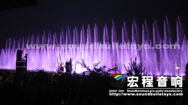 汉中市一江两岸音乐喷泉项目位于汉江新大桥至桥闸段,总投资3000多万。音乐喷泉扩声系统采用了广州市宏程音响工业有限公司生产的声必力全天候线性扩声系统。