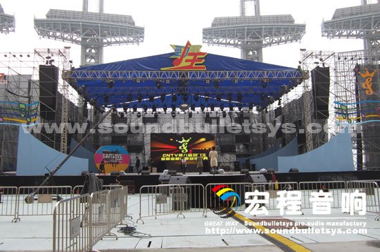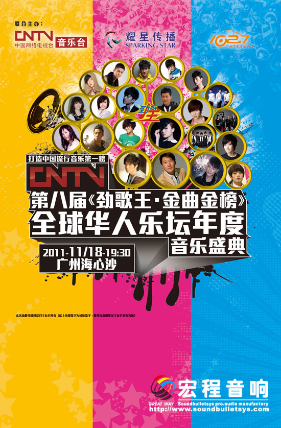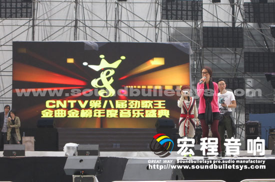 第八届《劲歌王·金曲金榜》年度总选,广州宏程音响工业有限公司调用了1610十寸线性音箱和1615寸线性音箱, 24只单十八寸超低音箱、815寸专业返听音箱和宏程音响主打PRO功放,为本次演出提供了强大的扩声系统支持.