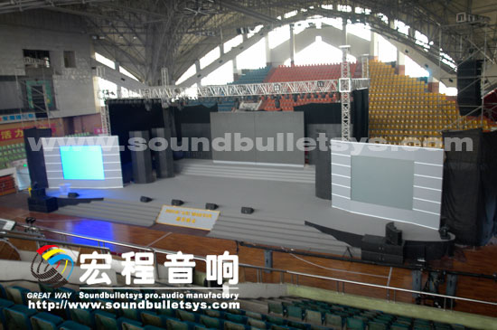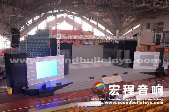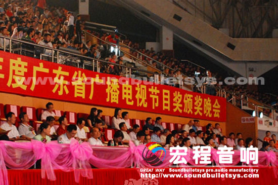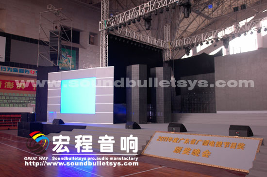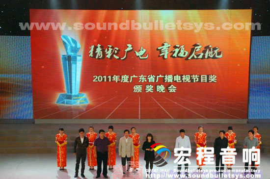 本次 2011年度广东省广播电视节目奖颁奖晚会扩声工程,现场采用了广州宏程音响工业有限公司生产的16只声必力LA-12F 十二寸线性,8只声必力CB-2超低音箱,和十只MA-15返听音箱。