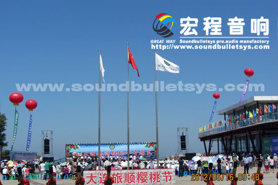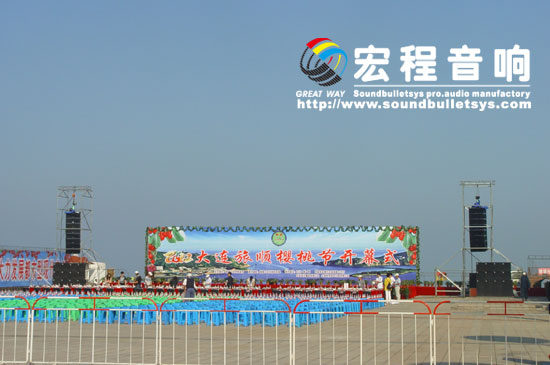 16只广州宏程音响工业有限公司生产的声必力LA12F十寸线性、8只声必力CB2超低音箱组成的主扩系统,为本次大连旅顺樱桃节开幕成功举行提供了强有力有保障。