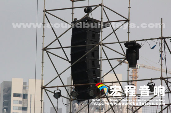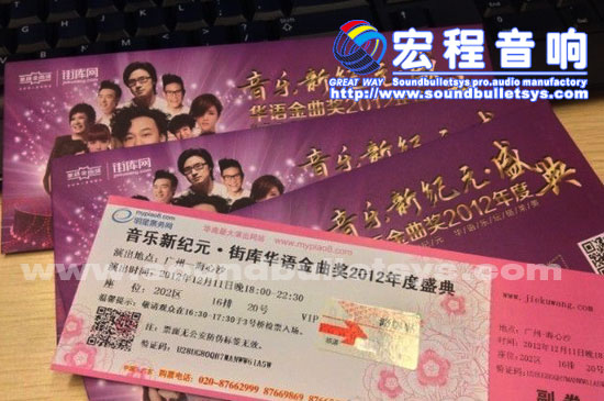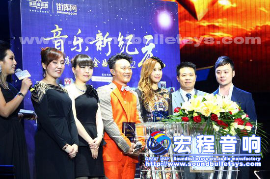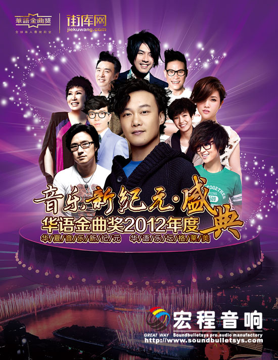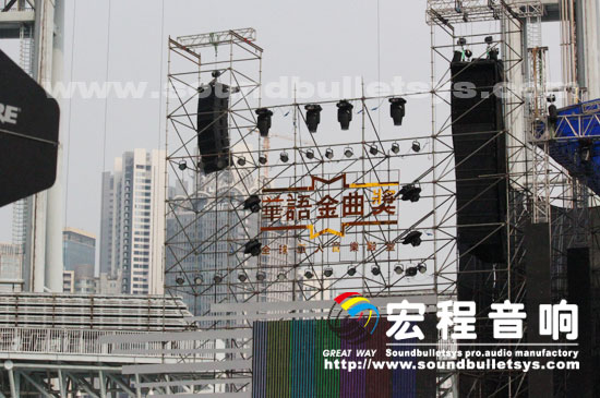 本次华语金曲奖2012颁奖盛典由广州宏程音响战略合作伙伴恒隆公司承接,现场共用了24只十二寸线性、16只十寸线性、16只超低音箱及8MA-15返听音箱。功放上采用了宏程公司2012年新品DSP系列功放。