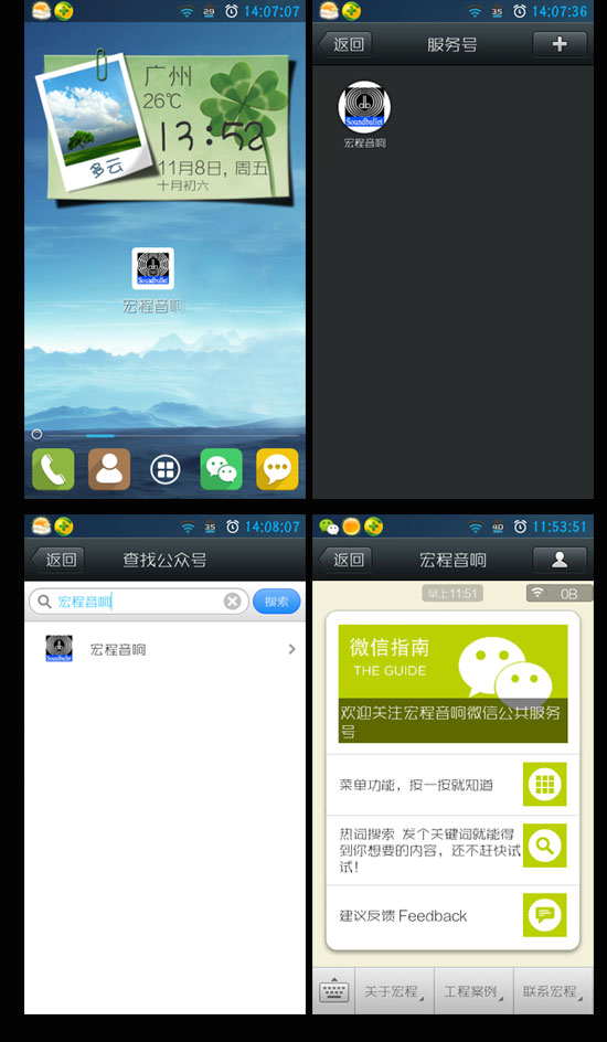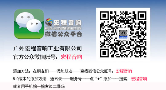 2013111,广州宏程音响工业有限公司微信公众平台(宏程音响)开通,其服务号“宏程音响”(微信号:soundbulletsys)正式上线发布,宏程音响由此成为专业音响行业第一家开通个性化定制菜单式交互官方微信的企业,为企业服务与客户沟通开创了全新的实践方式。