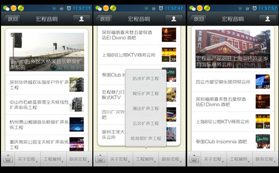 “工程案例”为案例介绍服务功能,目前下设“ 防水扩声工程”、“娱乐扩声工程”、“演出扩声工程”“会议扩声工程”“体育馆扩声工程”五个二级菜单,客户可以通过微信以最快捷的方式查询宏程公司经典工程案例。