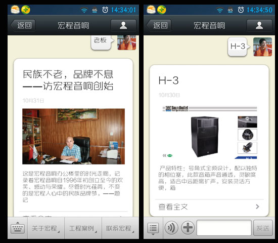 继开通新浪官方微博后,宏程音响在今年7月就开始测试官方微信。85日微信升级为5.0版后,依托该版本的新理念、新功能,公司企划部紧张开发和调试,正式推出了官方微信公众平台。