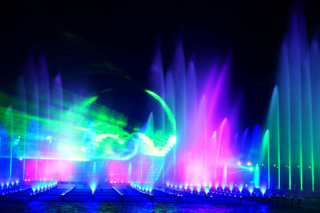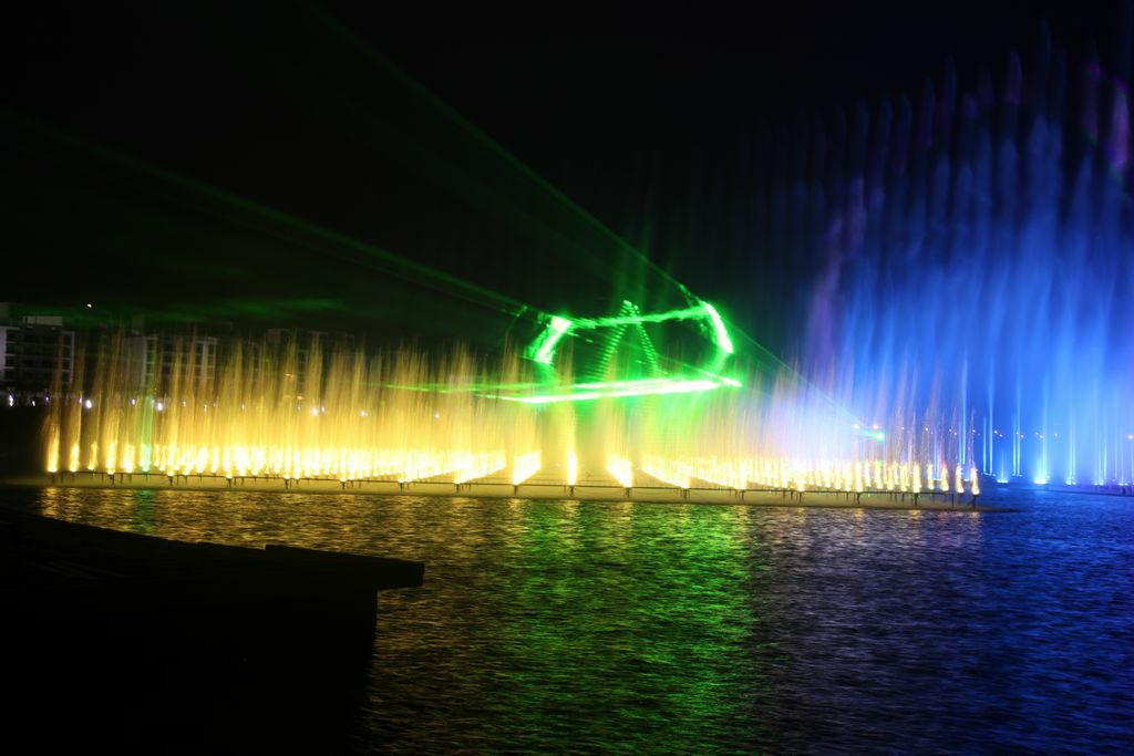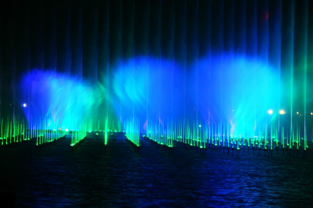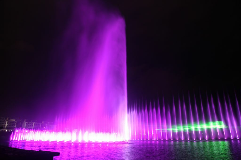 兰州新区音乐喷泉位于2号湖滨区庆典广场东侧,整个音乐喷泉长约168米,宽约100米,装机总容量4100KW.此音乐喷泉拥有15大类水景喷泉设计,共有838个喷头。这838个喷头是相互独立的,每个喷头都单独可控,也就相当于838个独立的“演员”按照设计进行自由的表演,表演方式变化万千,美轮美奂。天色空幽,水面灵动,舞者妙曼……何似在人间!