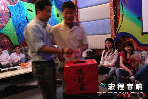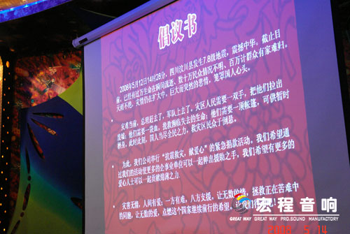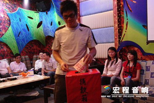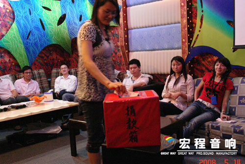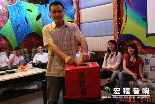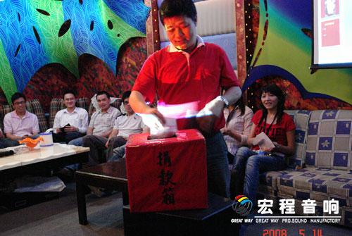 根椐公司实际情况,本次活动分三个会场(公司销售部\公司音箱厂\公司功放厂)举行, 5月14号下午首场活动在宏程音响销售部包房举行.公司总经理出席了本次活动并讲话,他指出:希望通过我们的活动,使更多的企事业单位可以一起伸出援助之手,希望有更多的爱心人士可以一起贡献绵薄之力.”