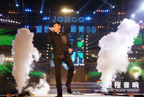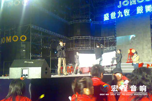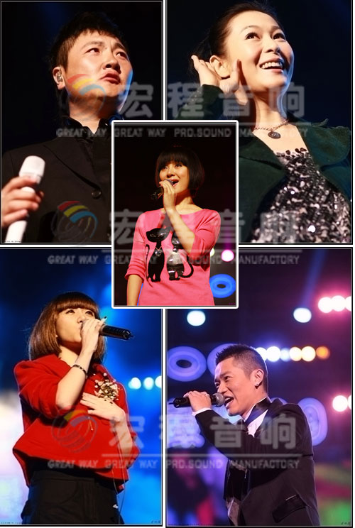 本次晚会,现场扩声系统采用了广州宏程音响工业有限公司生产的声必力线性扩声系统。震撼度令全场观众更加投入,椐音响工程人员介绍,当晚共用了16只12寸线阵音箱作主扩,并配有12只Soundbullet CB-1超低音,12只Soundbullet MA-15 返听 功放方面也是采用了宏程音响主打PRO系列产品。