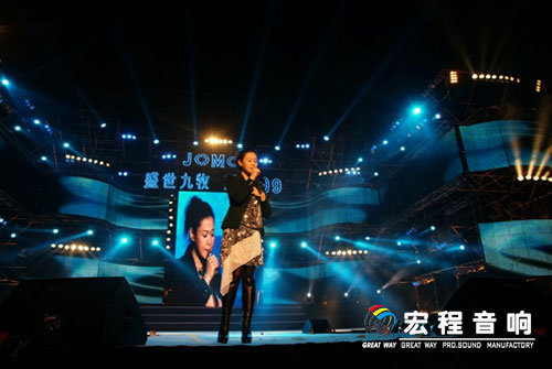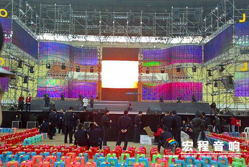 本次音响系统由广州宏程音响工业有限公司全力提供。整个音响系统使用K.TDN6000频普仪进行现场测试,达到设计效果,观众区的声压普遍达到100dB.