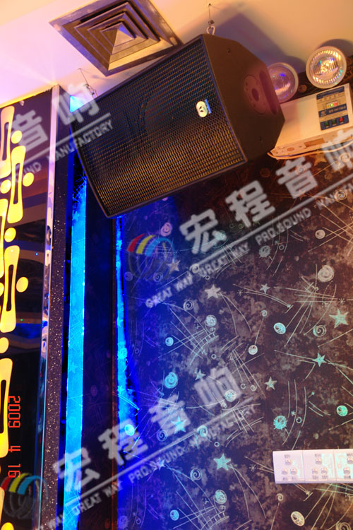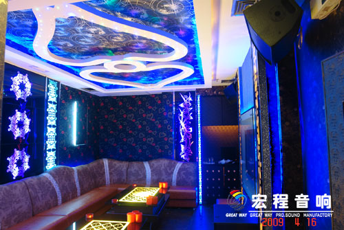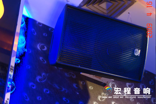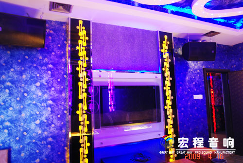 广州宏程音响工业有限公司工程部,根椐建声为主,扩声为辅的原则,结合工程方对音响系统提出的” 既要HI得起,又要唱得好的要求,”采用了声必力(Soundbullet)AF系列全频音箱和SUB超低音系列音箱,作为本次工程的首选音箱,并配用美极声EA系列功放.