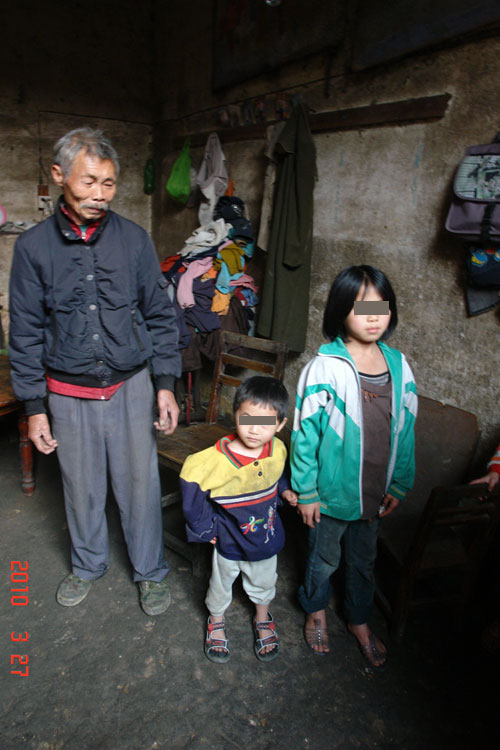 受资助学生小娣(右一)和她现年67岁的父亲(左一)及弟弟