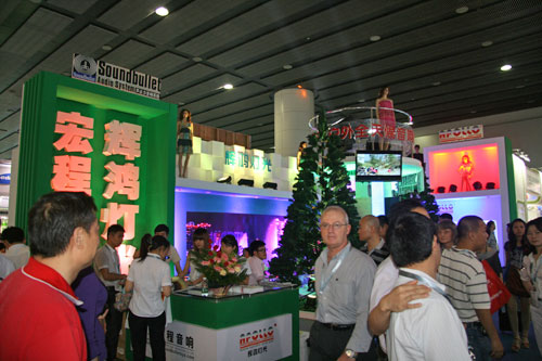 广州辉鸿灯光器材有限公司、广州宏程音响工业有限公司共同携手参加了本次展会。辉鸿灯光展出的LED舞台灯在其他普通照明产品展位的簇拥下格外引人瞩目,犹如众星捧月般,受到参展人员追捧。宏程公司携多款新产品亮相展会,并重点展出了在国内具有领先地位的全天候防水音箱。