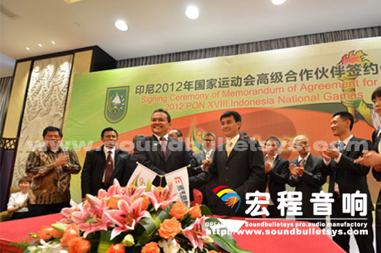 2011年07年12日,印尼廖内省省长RUSLI ZAINAL先生及印尼全运会组委会主席SYAMSURIZAL BIN AMIR ELWALID先生等一行领导及官员,与番禺区区长娄旭逵、锐丰音响董事长王锐祥及相关部门负责人,在广州市长隆酒店象牙厅,共同参与2012年印尼全运会高级合作伙伴签约仪式。锐丰音响与印尼国家运动会组委会签约,成为其高级合作伙伴。这是番禺人的骄傲,这是中国专业音响人的骄傲。