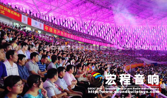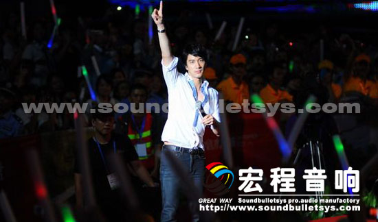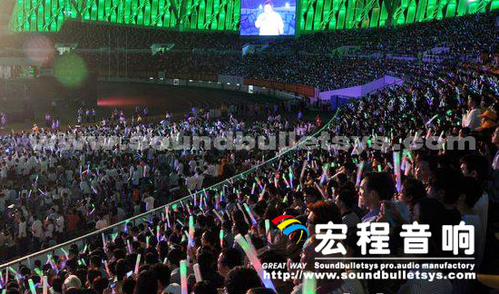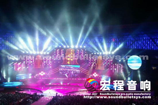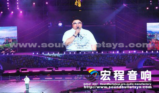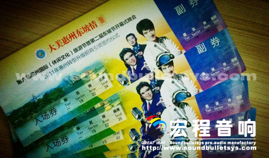 本次本次第六届惠州国际(休闲文化)旅游节,广州宏程音响工业有限公司调用了28只10十寸线性音箱和20只15寸线性音箱, 28只单十八寸超低音箱、16只15寸专业返听音箱和宏程音响主打PRO功放,为本次演出提供了强大的扩声系统支持.为了保障晚会效果在周边器材面均采用了国内外知名品牌产品,以确保晚会万无一失。