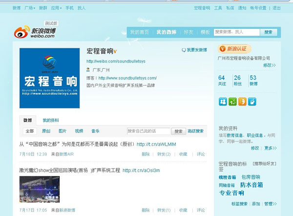 为更好地推广宏程音响品牌与产品,加强同广大消费者及用户的沟通与互动,广州宏程音响工业有限公司官方微博“宏程音响”(http://weibo.com/soundbulletsys)于2011年7月19日正式上线。
