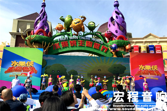 4月28日,都江堰市首个大型室外主题乐园——水果侠主题乐园盛大开园,宏程音响2017年新款CH系列和LA演出系列80多只防水音箱为该项目保驾护航。