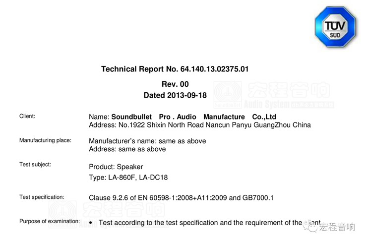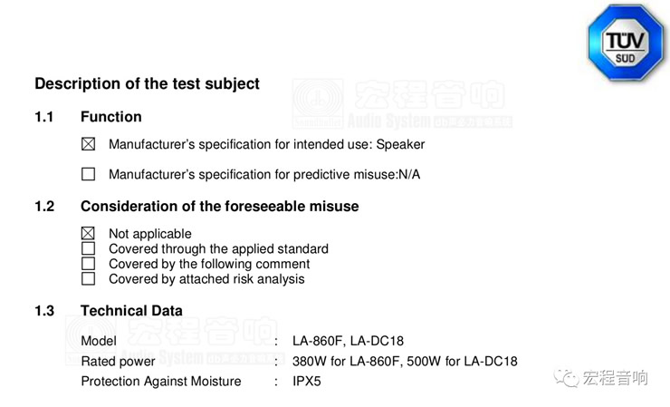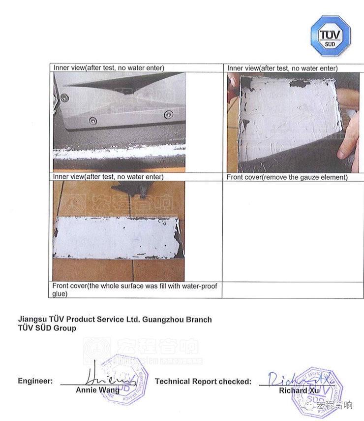对于防水认证,宏程音响只认TUV认证。