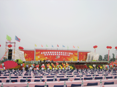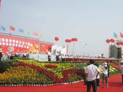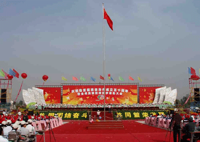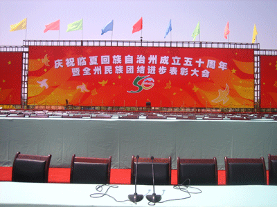 一大早,身着节日盛装的临夏各族群众从四面八方赶往临夏市东郊的州体育场,与中央有关部门祝贺团、省祝贺团和兄弟州市、友好地区的嘉宾欢聚在美丽的大夏河畔,载歌载舞欢庆自治州成立50周年。 全国人大常委会、国务院发来贺电。贺电说,50年来,临夏回族自治州政治稳定,经济发展,民族团结,社会进步,人民生活不断改善,各项事业取得了可喜的成就。希望临夏人民在以胡锦涛同志为总书记的党中央领导下,高举邓小平理论和“三个代表”重要思想伟大旗帜,认真贯彻落实党的十六大和十六届三中、四中、五中全会精神,按照科学发展观和构建社会主义和谐社会的要求,坚持共同团结奋斗、共同繁荣发展,开拓创新,求真务实,为建设富裕、文明的家园,为不断把我国民族团结进步事业推向前进,为实现全面建设小康社会的宏伟目标,做出新的更大的贡献。